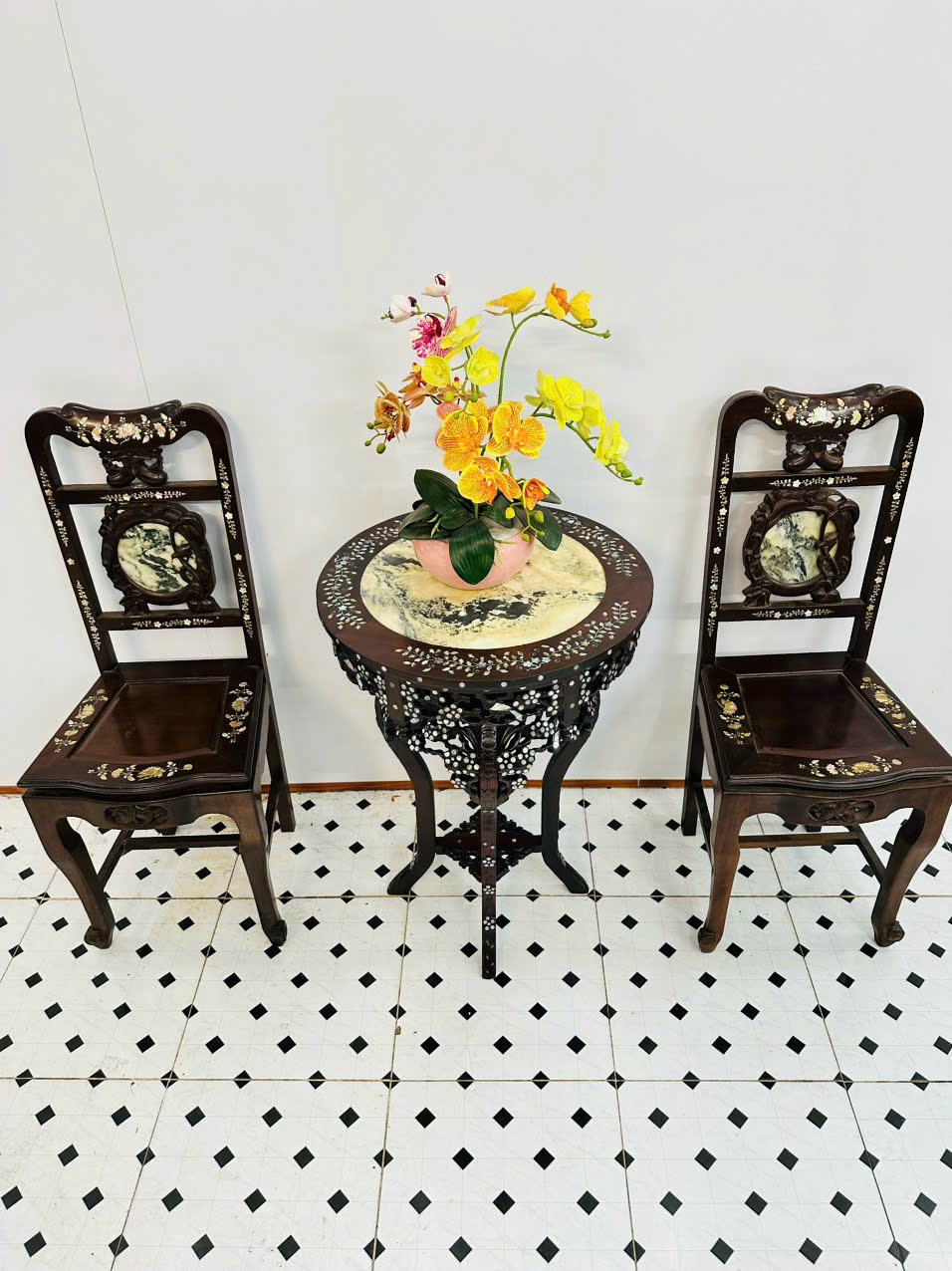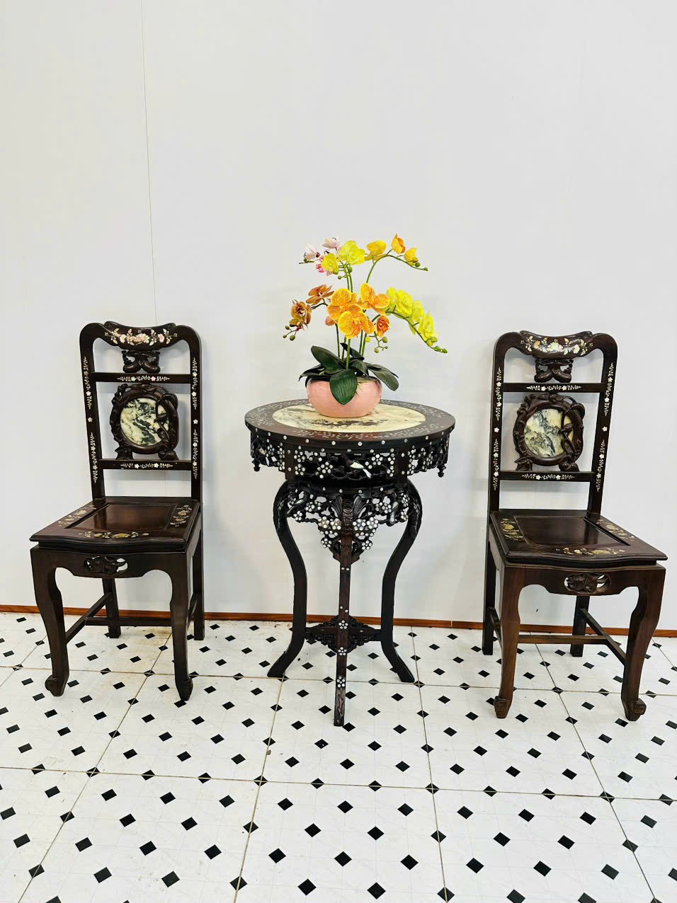 một trong những bộ ghế uống trà rất đẹp, nổi bật gồm 3 món gọn gàng, ngăn lắp, dễ kê. Giới thiệu tới quý khách hàng mẫu sản phẩm Bộ Bàn Trà Khảm Cẩn Ốc gồm 2 ghế có tựa ngồi thoải mái và một đôn váp mặt đá tròn chạm hoa mai nổi bật. Dưới đây là hình ảnh và thông tin chi tiết rõ nét