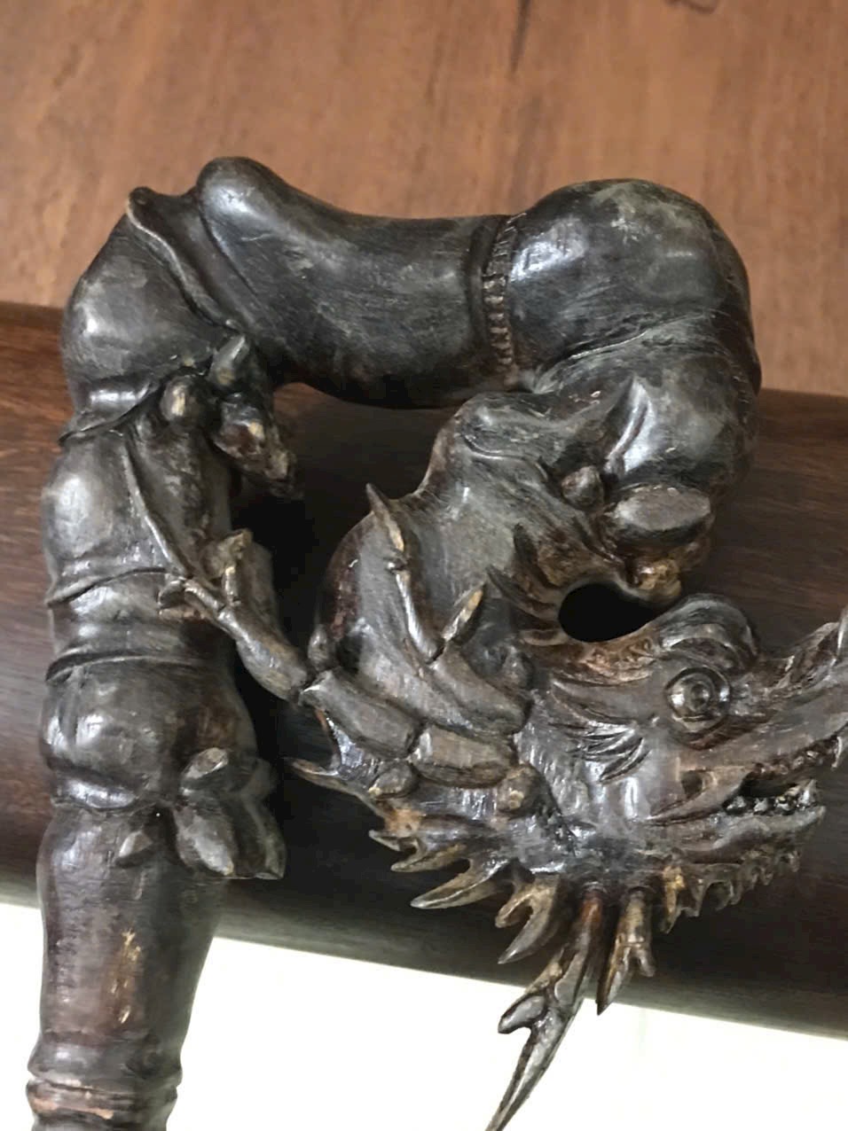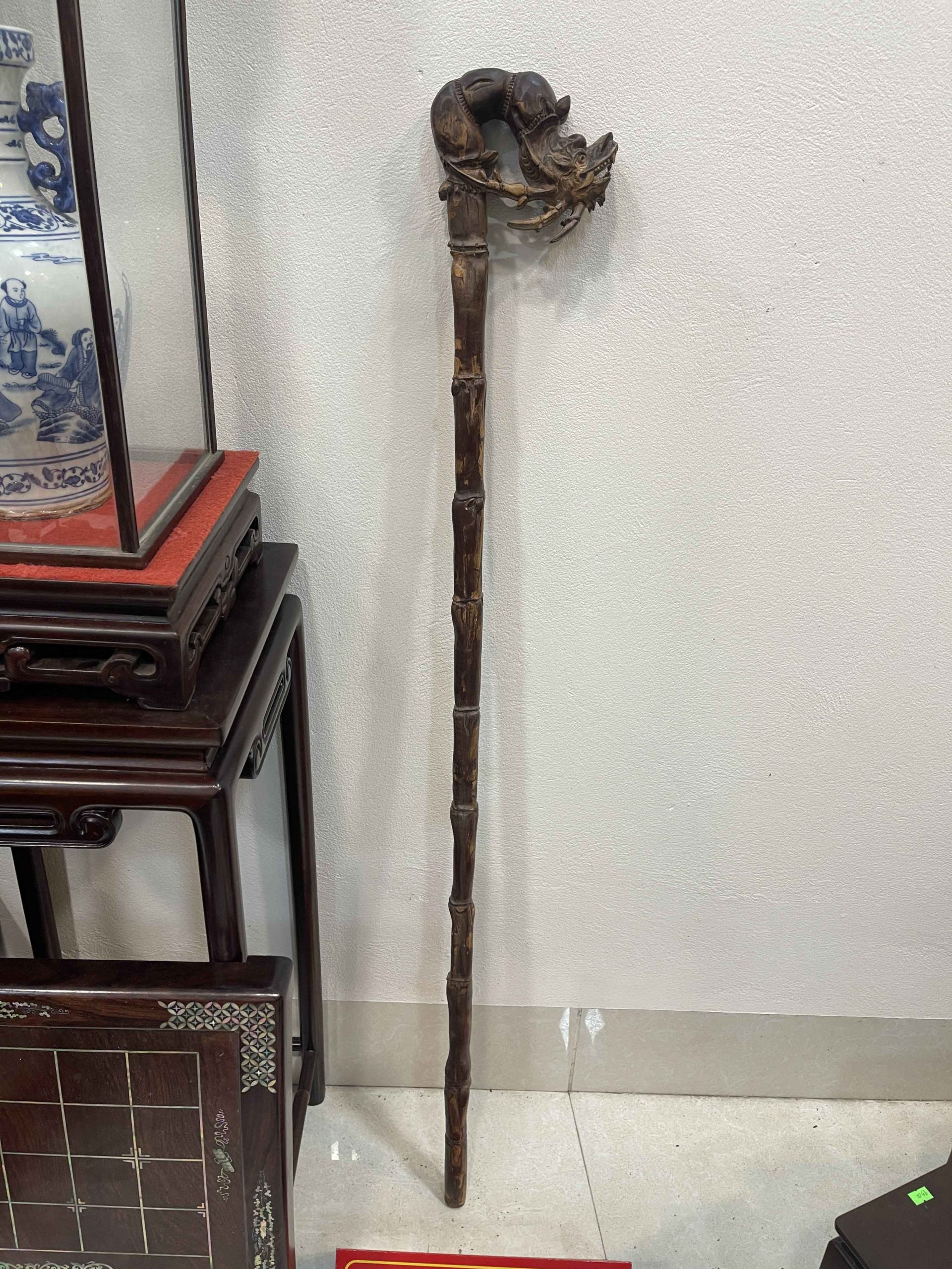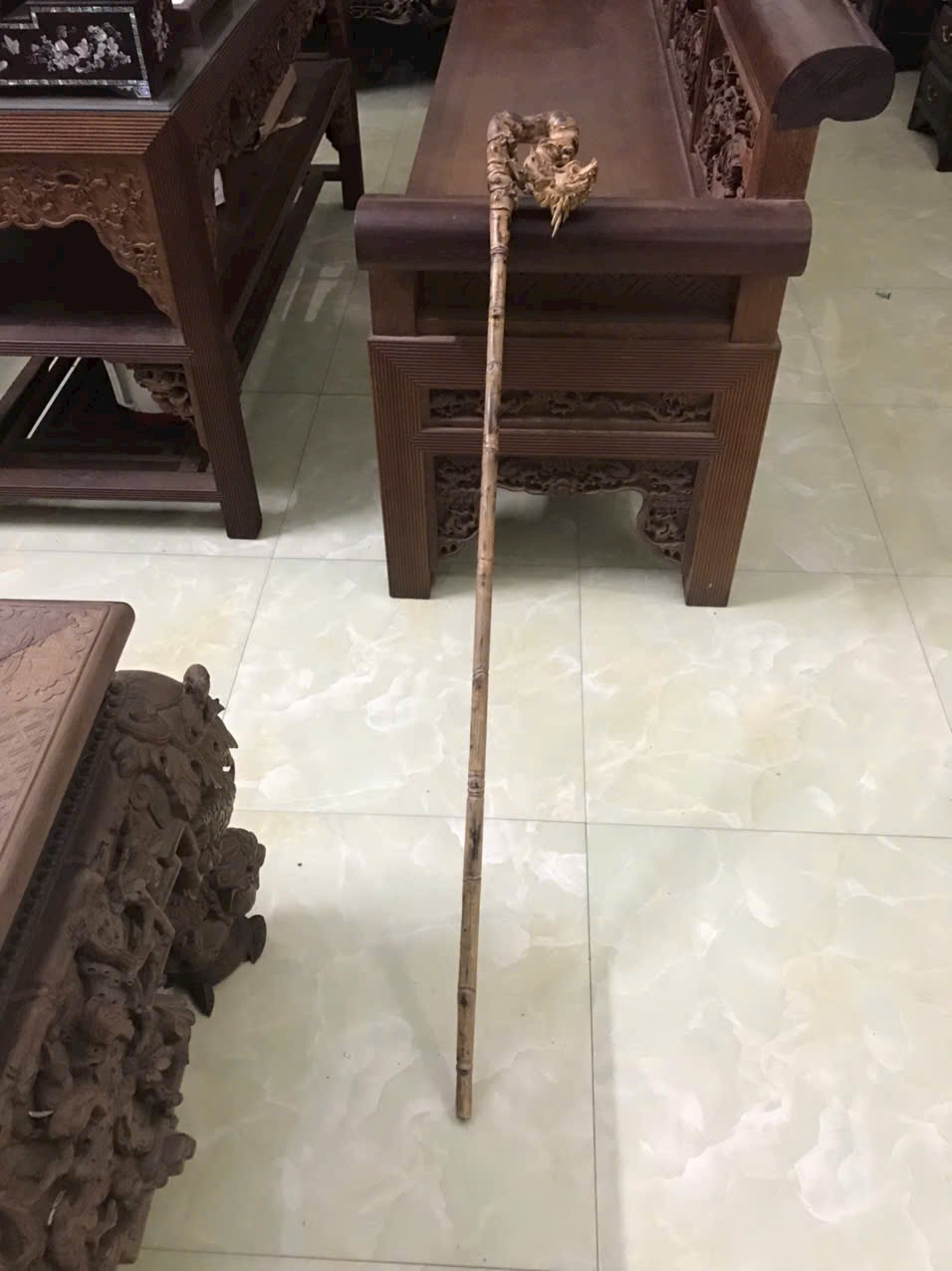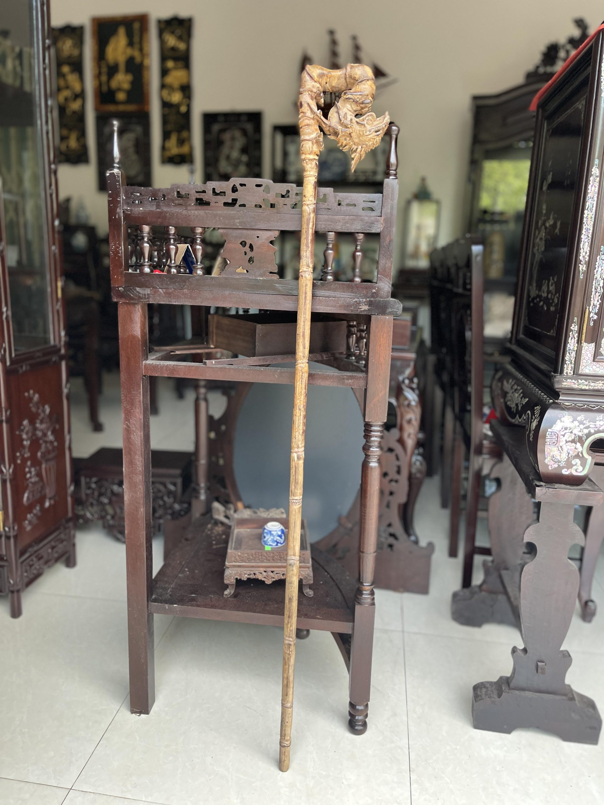 gậy batoong gỗ gụ đục chạm đầu rồng thân trúc