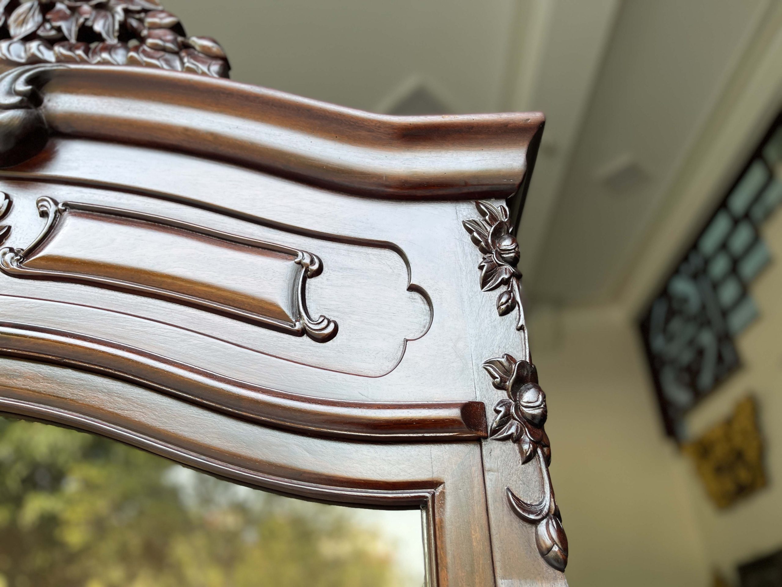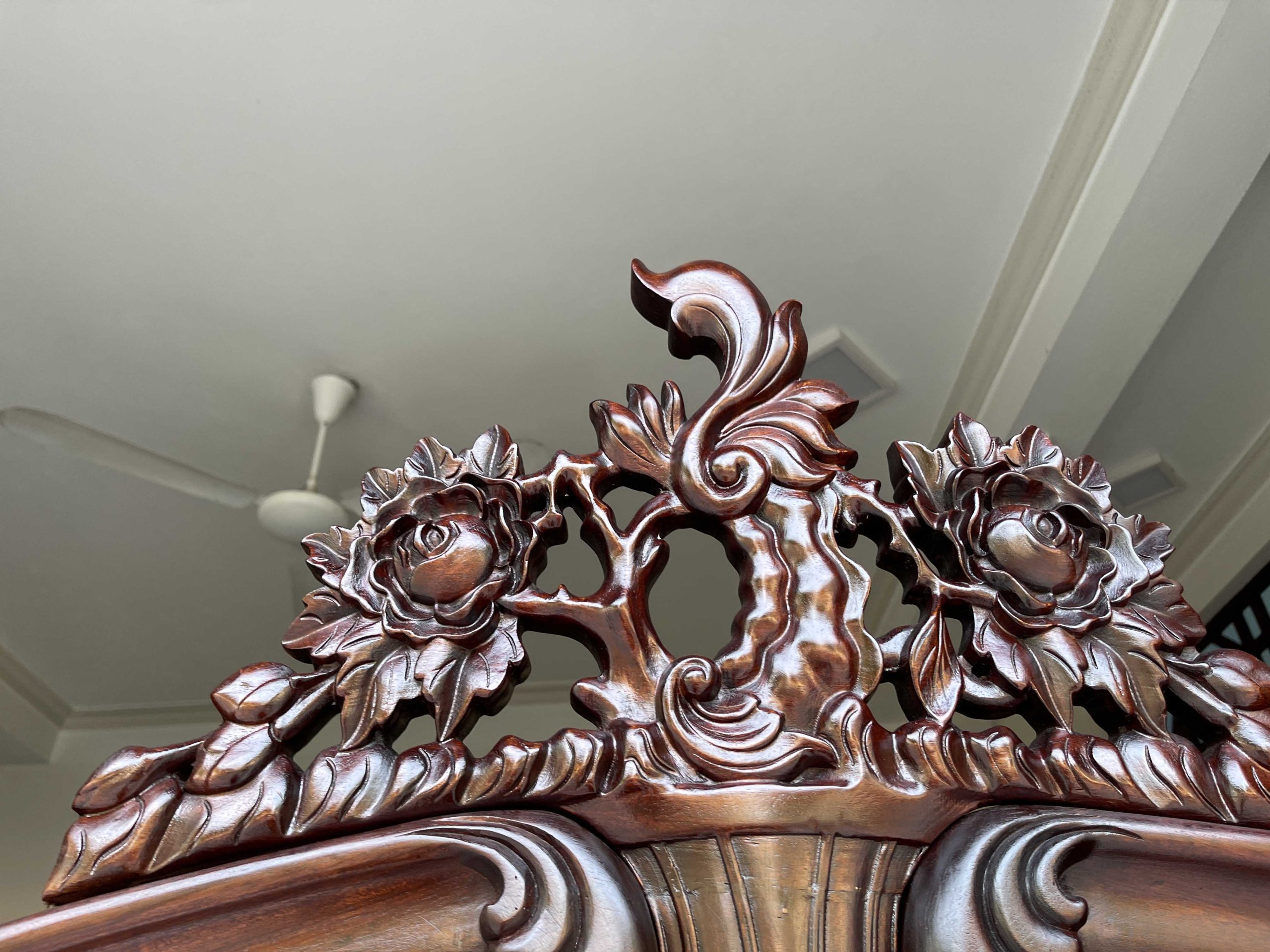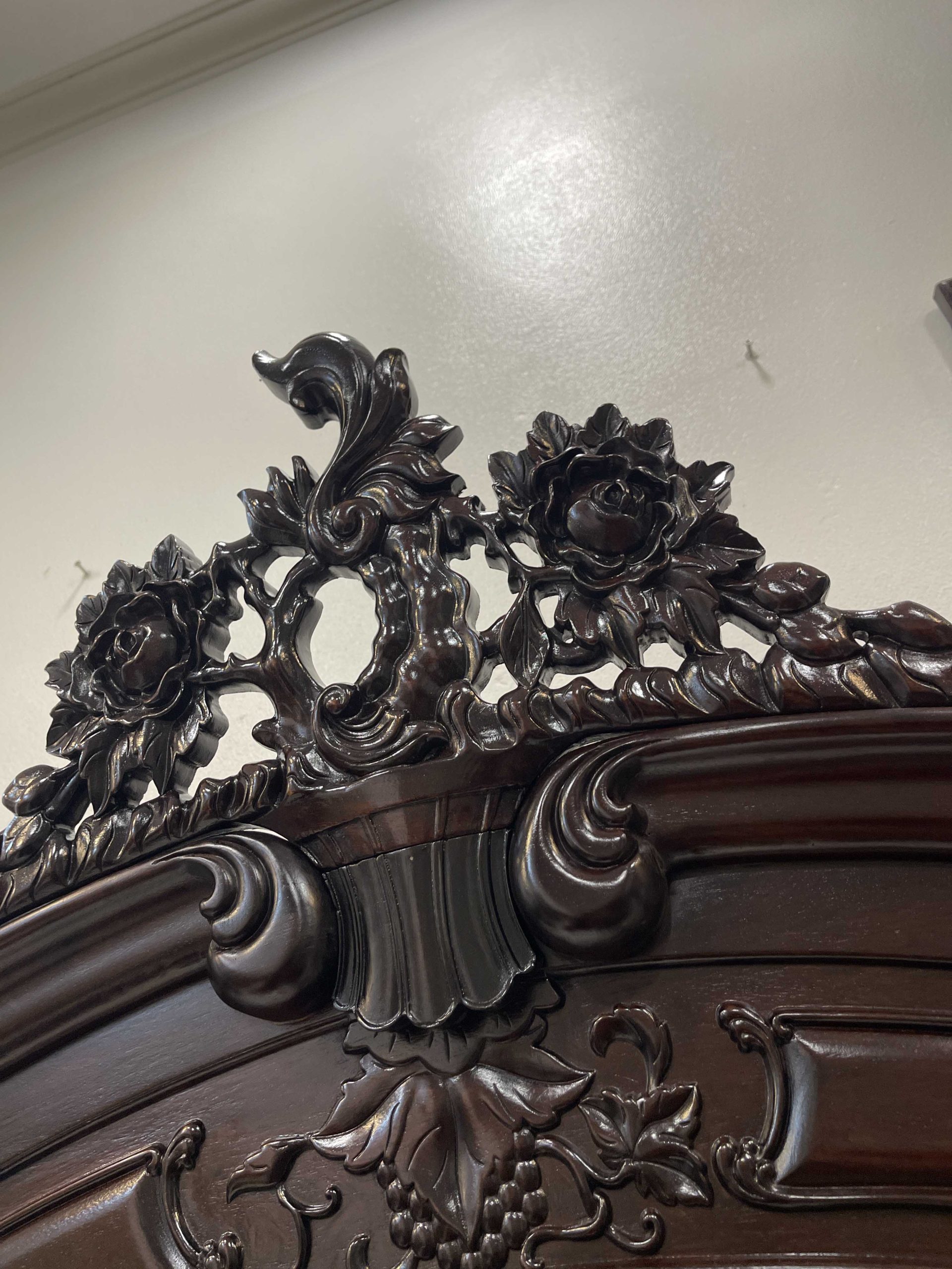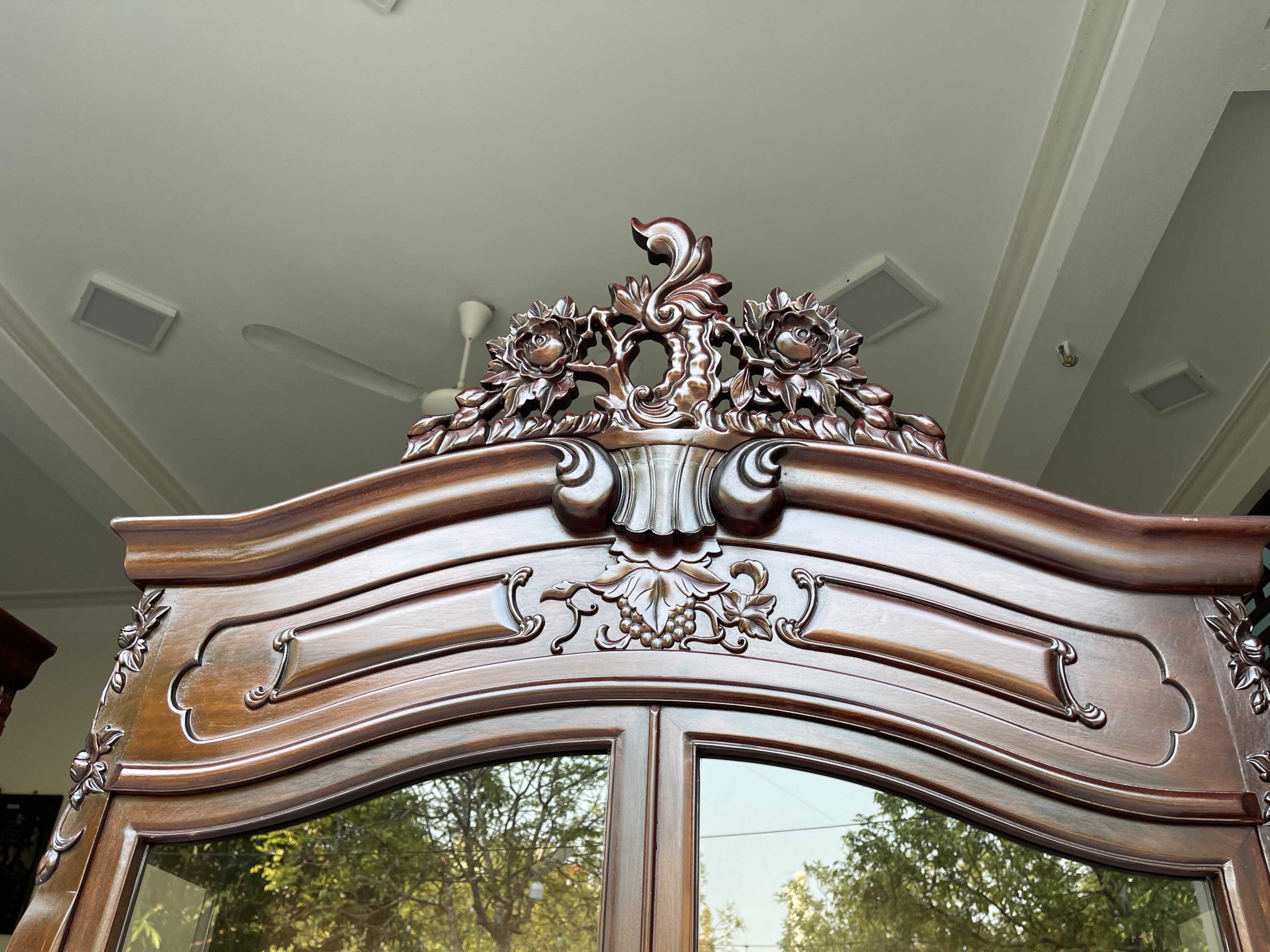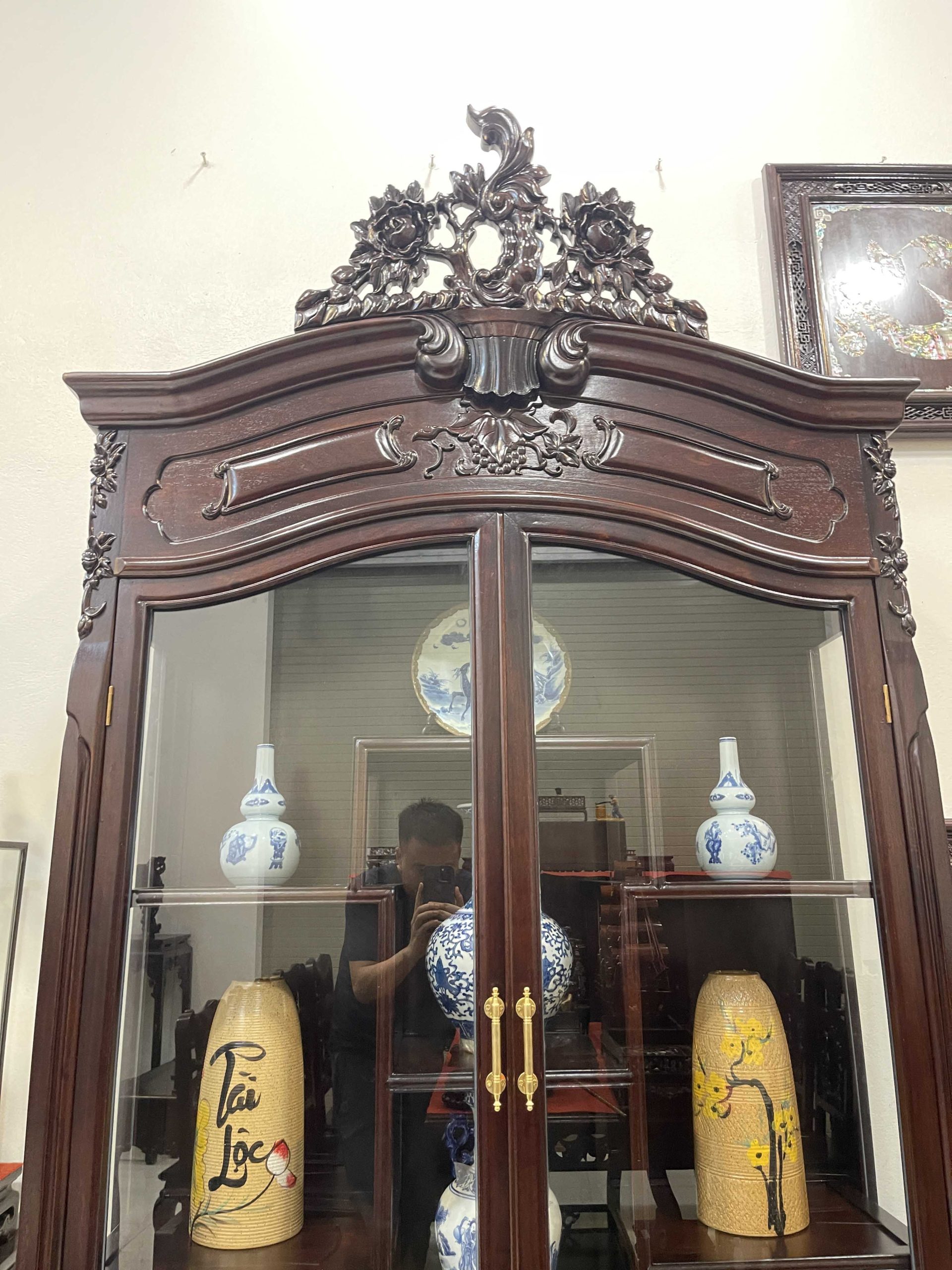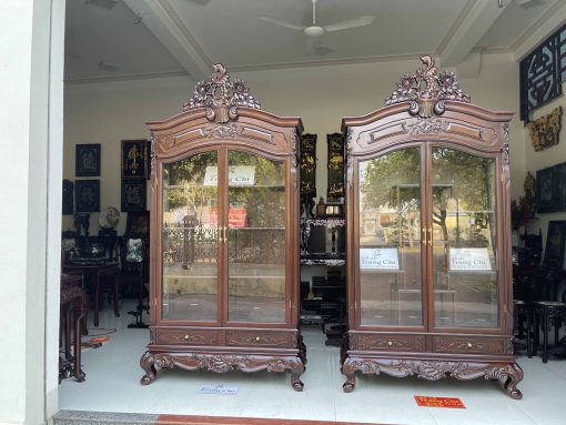 Tủ bày đồ với nét đục chạm hoa hồng, hoa lá tây mềm mại kết hợp đan sen mang đến cho không gian trưng bày sự sang trọng và cao cấp hơn. Những đường nét còn mang đến sự mềm mại và quý phái