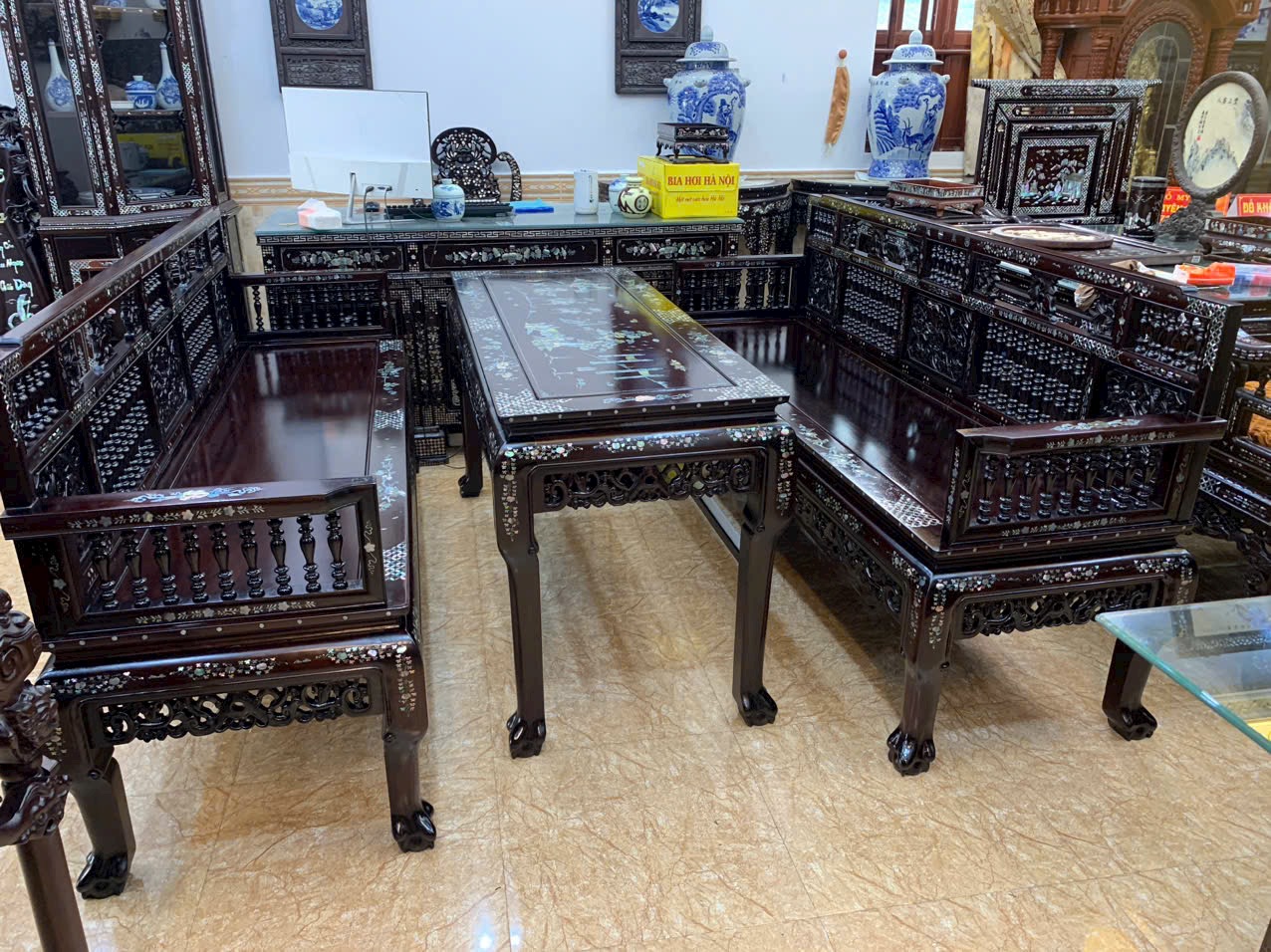 xin giới thiệu tới quý khách hàng một sản phẩm Trường Kỷ Song Tiện Khảm Cẩn Ốc bộ gồm 3 món được làm rất đẹp, chau chuốt. Nghệ thuật đục chạm con tiện mang nét đẹp truyền thống xưa kết hợp cùng một bức tranh cẩn ốc được người nghệ nhân mô tả rõ nét trên ghế, đặc biệt phần mặt bàn. Dưới đây là hình ảnh thông tin chi tiết về sản phẩm