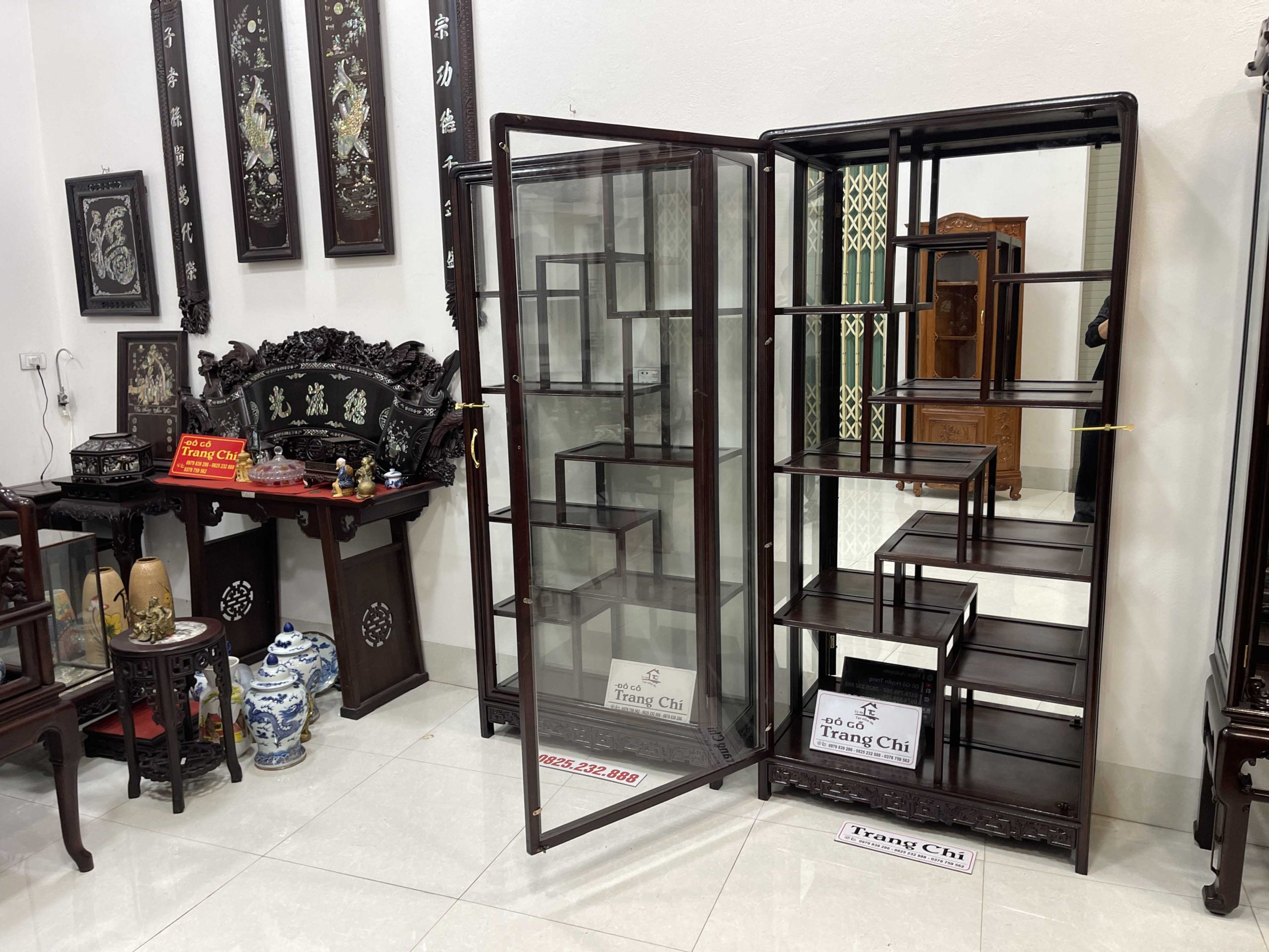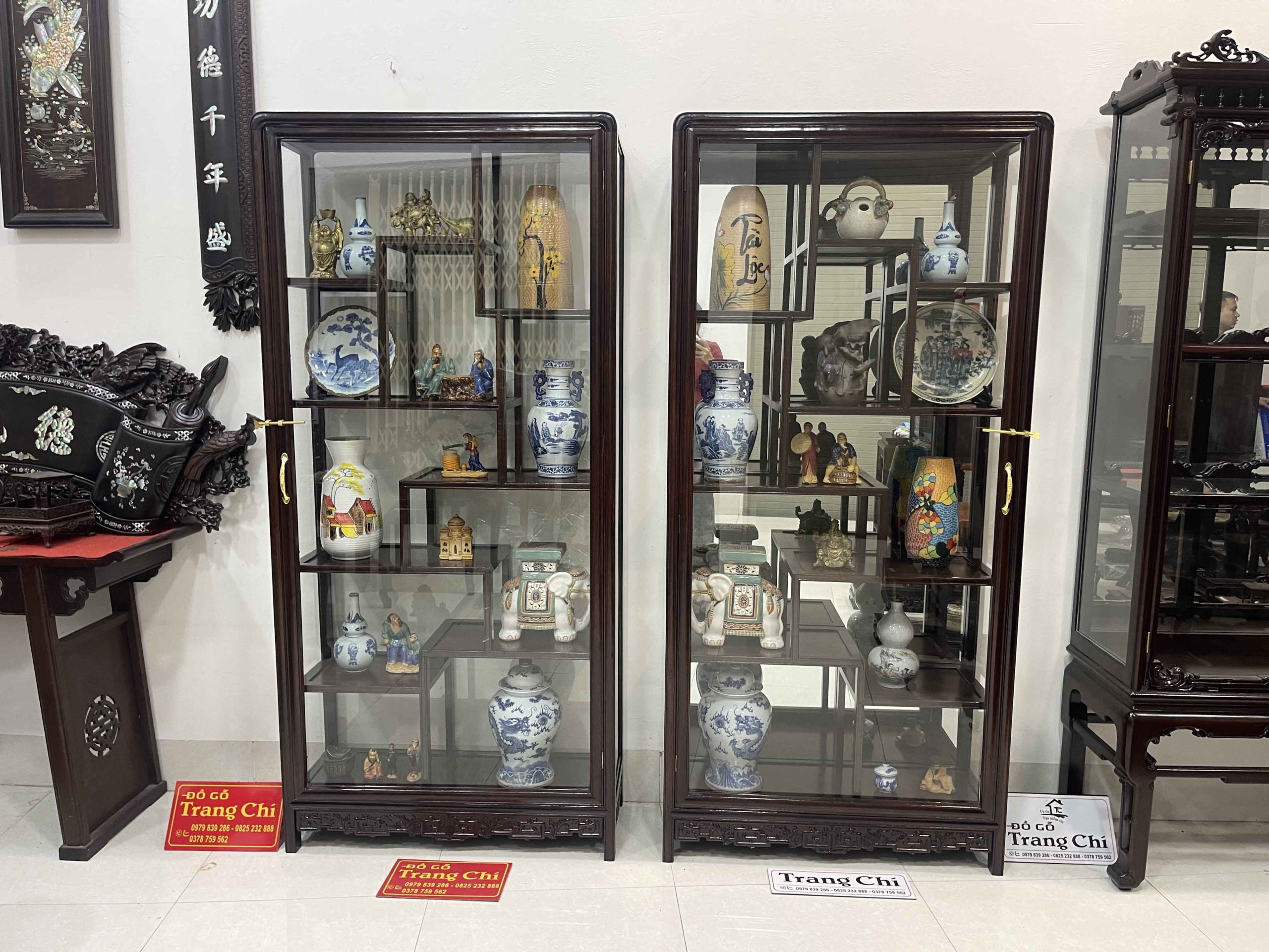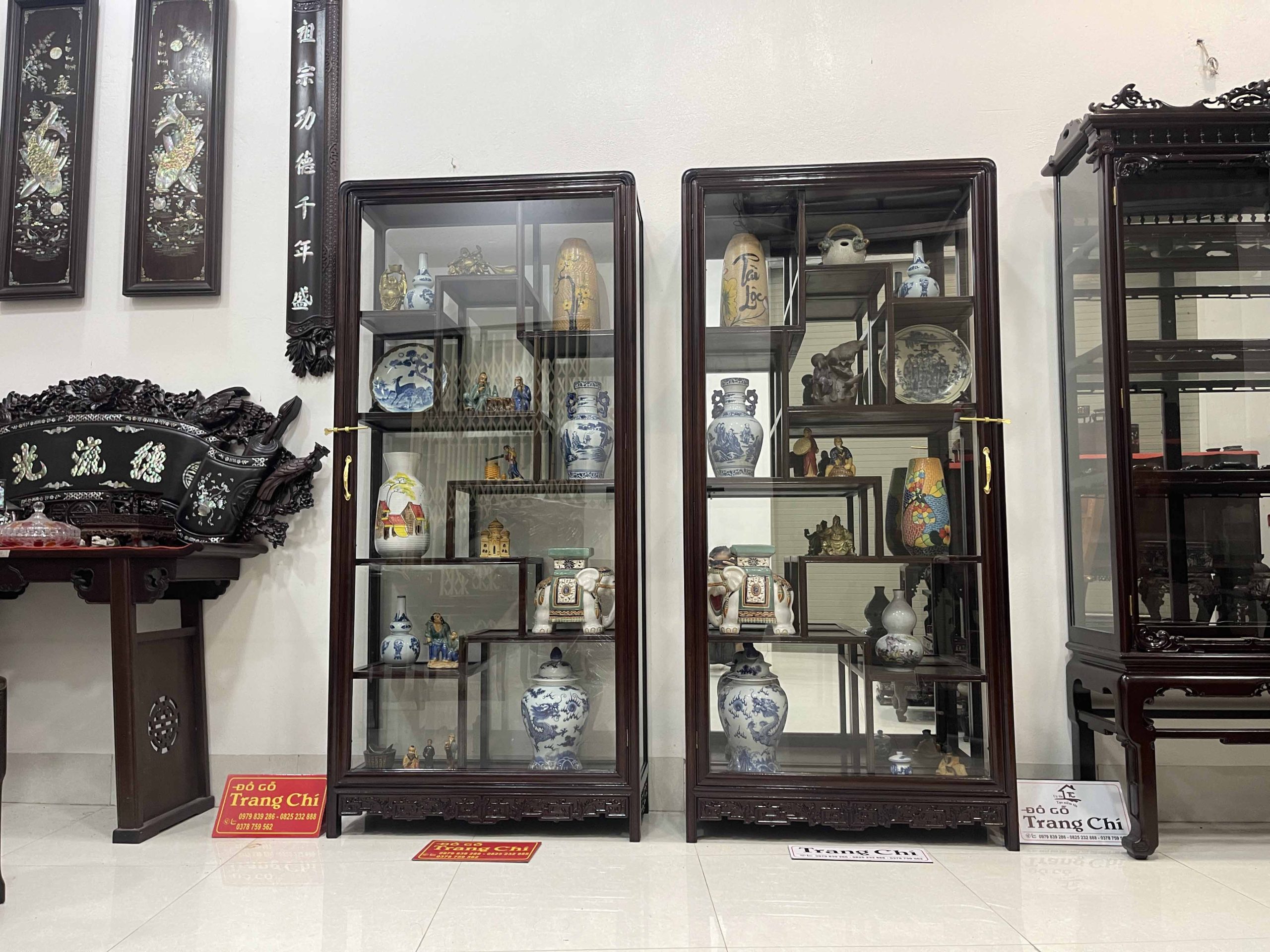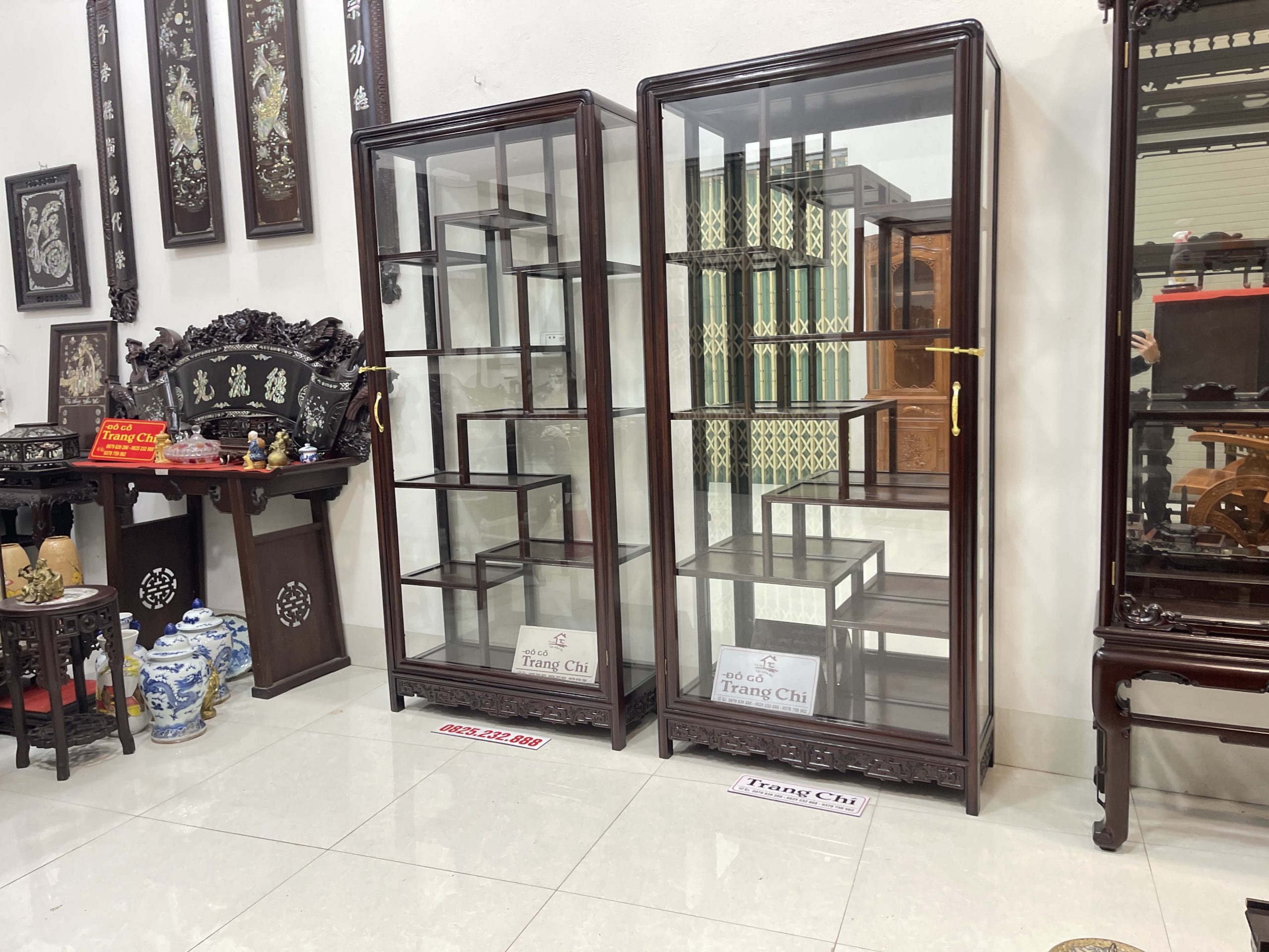 xin giới thiệu tới quý khách hàng Cặp Tủ Bày Đồ Gỗ Gụ Kính 4 Mặt được làm trên chất liệu gỗ gụ bền đẹp, mặt sàng gỗ. Đặc biệt cơ sở chúng em làm kính bao quanh nên khi quý vị trưng bày đồ sẽ rất nổi bật và ý nghĩa cung như sẽ tránh được bụi, và những món đồ sứ, đồ cổ khi trưng bày sẽ được ngăn lắp và nổi bật hơn. Dưới đây là là hình ảnh thông tin về sản phẩm